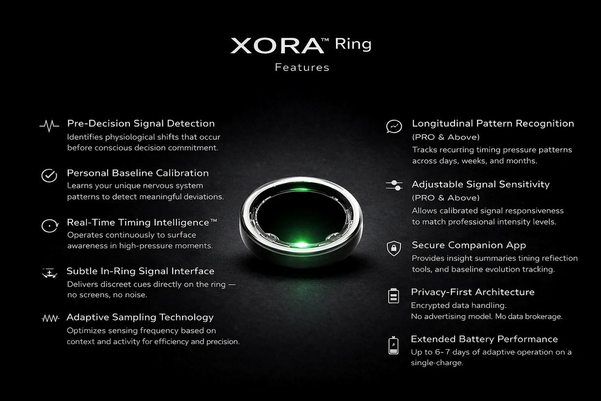 XORA Ring Consumer delivers foundational Timing Intelligence™ for everyday decisions. It detects subtle physiological shifts that rise under pressure and provides a discreet in-ring signal before action. Designed for personal awareness—not advice—it helps reduce regret caused by mistimed reactions, impulse moments, and emotional urgency. The ring stays subtle. The awareness becomes powerful.